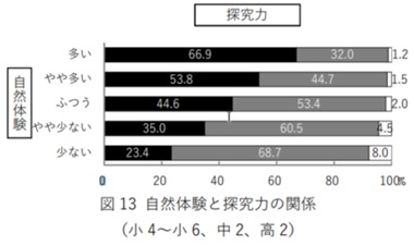 神経系の発達は、左図のように、10歳くらいまでにほぼ決定づけられます。幼児期から小学校中学年までの多様な運動や遊びが大切です。自然体験は、それ自体に多様性を持っており、神経系の発達を促すのに最適な環境と考えています。 また、近年重要度が増している「確かな学力」。「確かな学力」とは、ペーパーテストで100点であるとか記憶力ではなく、いわれる”問題解決能力”です。自然体験は、その”問題解決能力”の向上に大きな役割を果たすと考えています。社会はひとりひとりの「得意」を交換しあってなりたっています。ひとりひとりの得意や個性を引き出し伸ばすのが自然体験だと考えています。大学入試改革の記述式は”労多くして実なし”と考えますが、子どもの頃の”体験知”が大きな礎になるのは間違いないでしょう。自然体験は総合的なアクティブラーニングです。 ![]() |